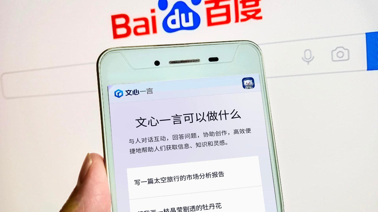 Pictured here is the Ernie bot mobile interface, with the Baidu search engine home page…