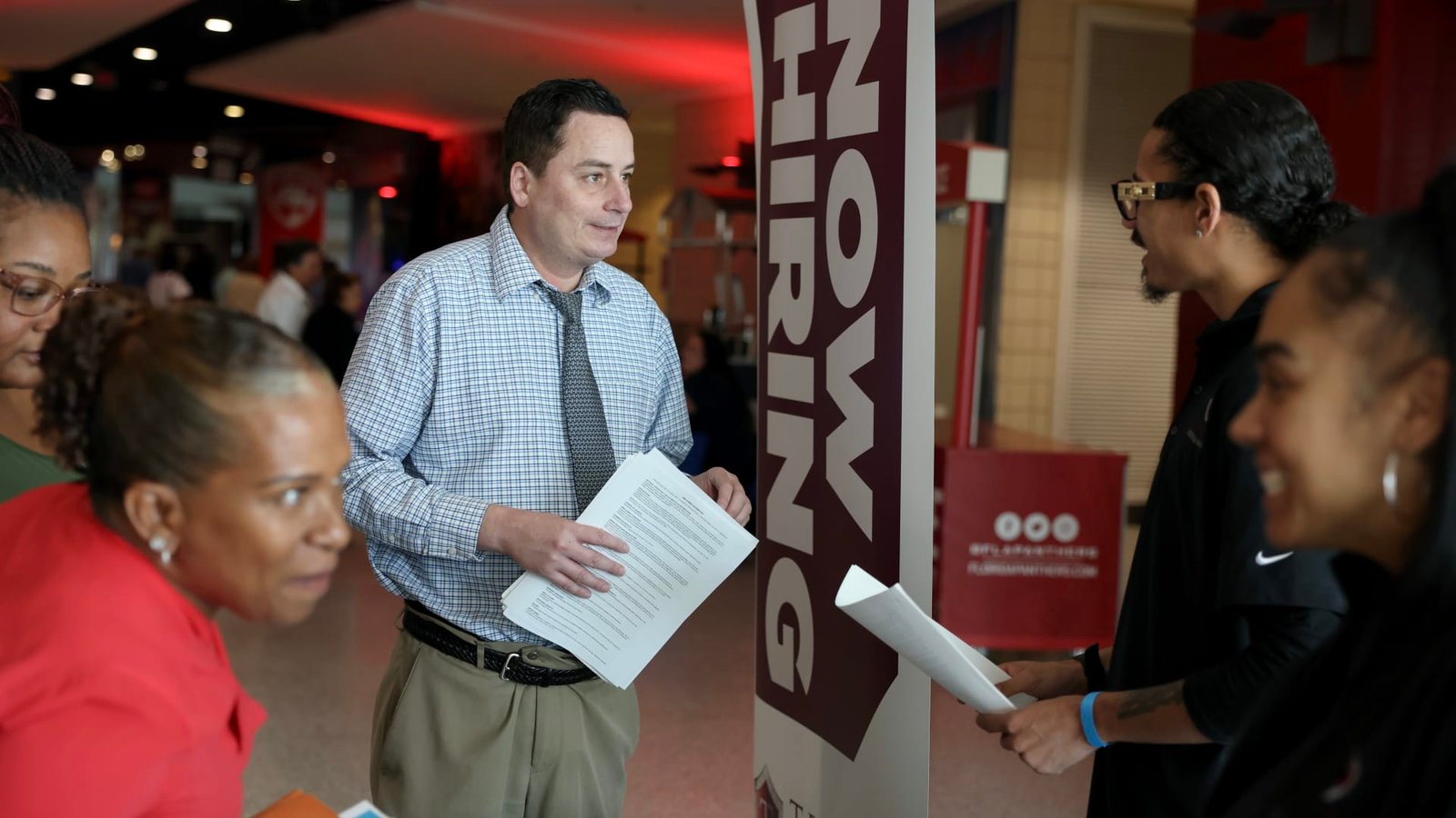 Mitch Graham (C) inquires about jobs at Triton Recovery during the Mega JobNewsUSA South Florida…