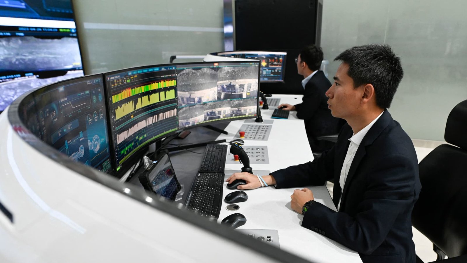 Employees at a coal mine in China's Shaanxi province sit in an office to use…