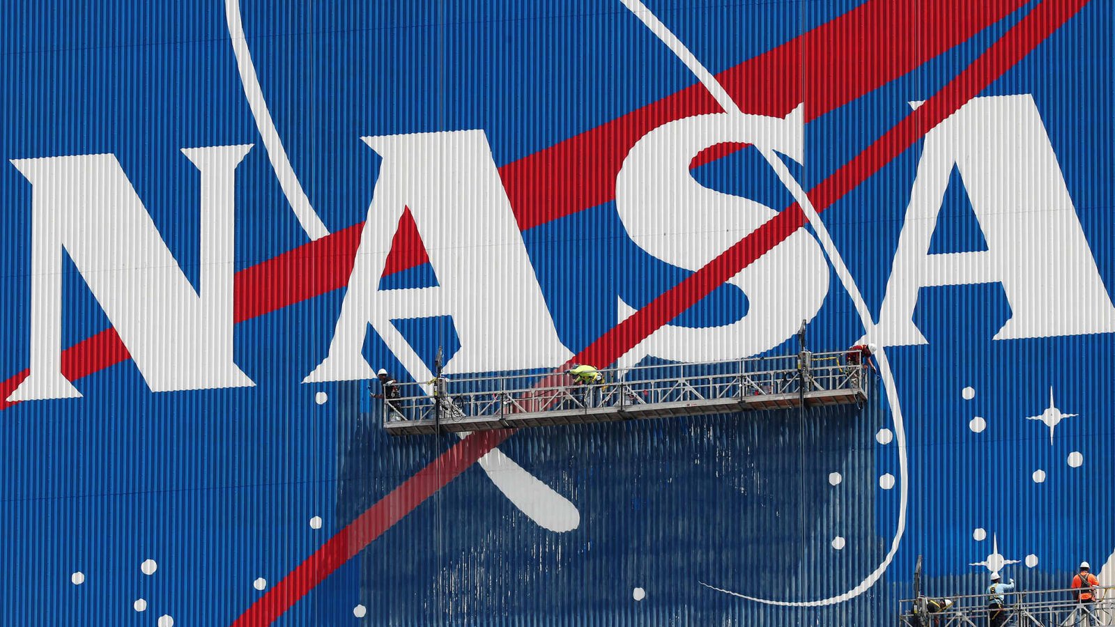 Workers repaint the NASA logo on the Vehicle Assembly Building at the Kennedy Space Center…