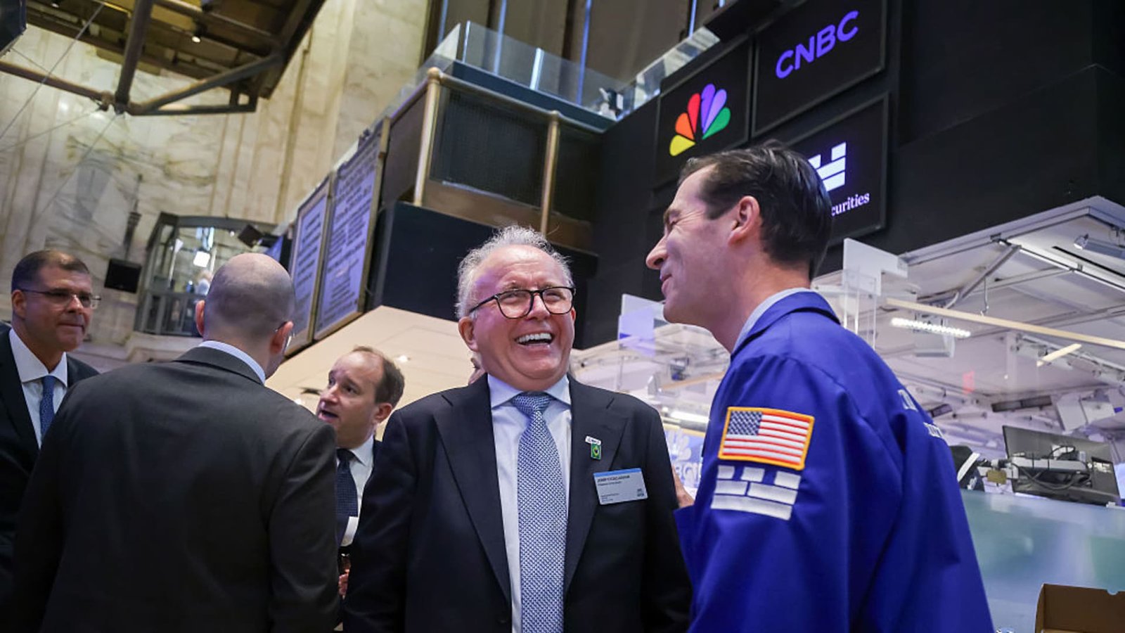 Jerry O’Callaghan, former chairman of JBS SA, center, speaks with a trader on the floor of the New York Stock Exchange in New York, U.S., on Wednesday, June 25, 2025.
